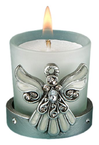 - Exquisite candle favor, from Fashioncraft's exclusive Regal Favor Collection, rhinestone enhanced pewter finish poly resin round base with a pewter and ivory inlaid enamel angel charm, nestling a white frosted glass holder with poured white candle inside