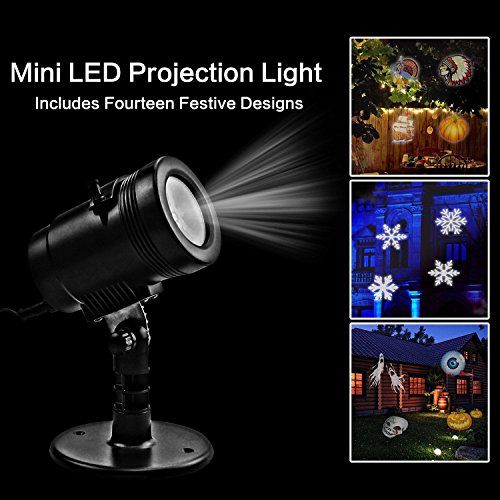 - 14 EXCLUSIVE DESIGN SWITCHABLE PATTERNS --- The Projector Light includes 14 interchangeable slides, such as Christmas, Halloween, Thanksgiving Day, White Snowflake and so on. You could change the different slices what ever you want and transform any area from ordinary to extraordinary.