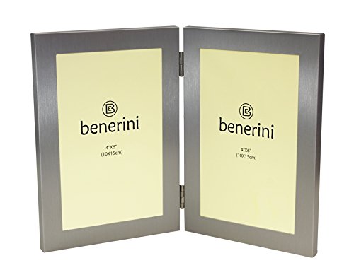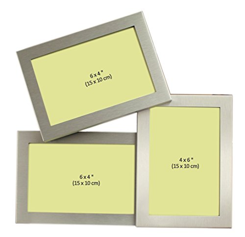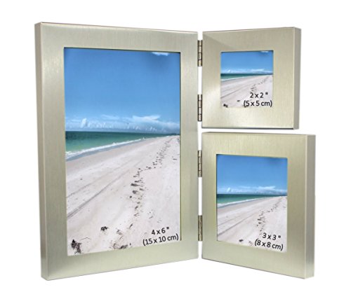 5 Picture Brushed Aluminium Satin Silver Colour Folding Photo Picture Frame - Will Take One Photo Of 5 x 7 inches (13 x 18 cm) & 4 Photos Of 2 x 3 inches (5 x 8 cm).Takes one photo of 5 x 7 inches (13 x 18 cm) & 4 photos of 2 x 3 inches (5 x 8 cm). Overall frame dimensions are 15 x 8 inches (38 x 20 cm). The frame border around the centre frame is approximately is 20mm all the way around. The picture frame is free standing.The back of the frame is covered in a black velvet effect material and just slides off for simple photo insertion.Feature