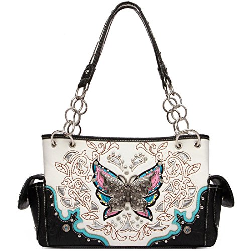 -. Brand : Cowgirl Trendy -. Color : Black -. Department : womens -. EAN : 0633210899142 -. Feature : Made from high quality tooled PU faux/imitation leather decorated with laser cut designs, rhinestones, silvertone studs, and silvertone butterfly on the front / Single compartment fabric lined interior divided with a medium zippered pocket and a zippered wall pocket on inside rear / Secure zippered pocket on the back for a concealed carry handgun (9 inches long x 5 inches wide) and one open pocket that can fit 5 inch phone / Matching wallet with single removable strap that can convert to wristlet / 1 zippered pocket; flat currency compartments and open pockets with expanding bellows on the inside ; 8 slots for credit cards -. PackageQuantity : 1 -. ProductGroup : Shoes -. ProductTypeName : HANDBAG -. Size : Large -. Title : Cowgirl Trendy Butterfly Laser Cut Carry Concealed Handbag and Wallet-Black -. UPC : 633210899142