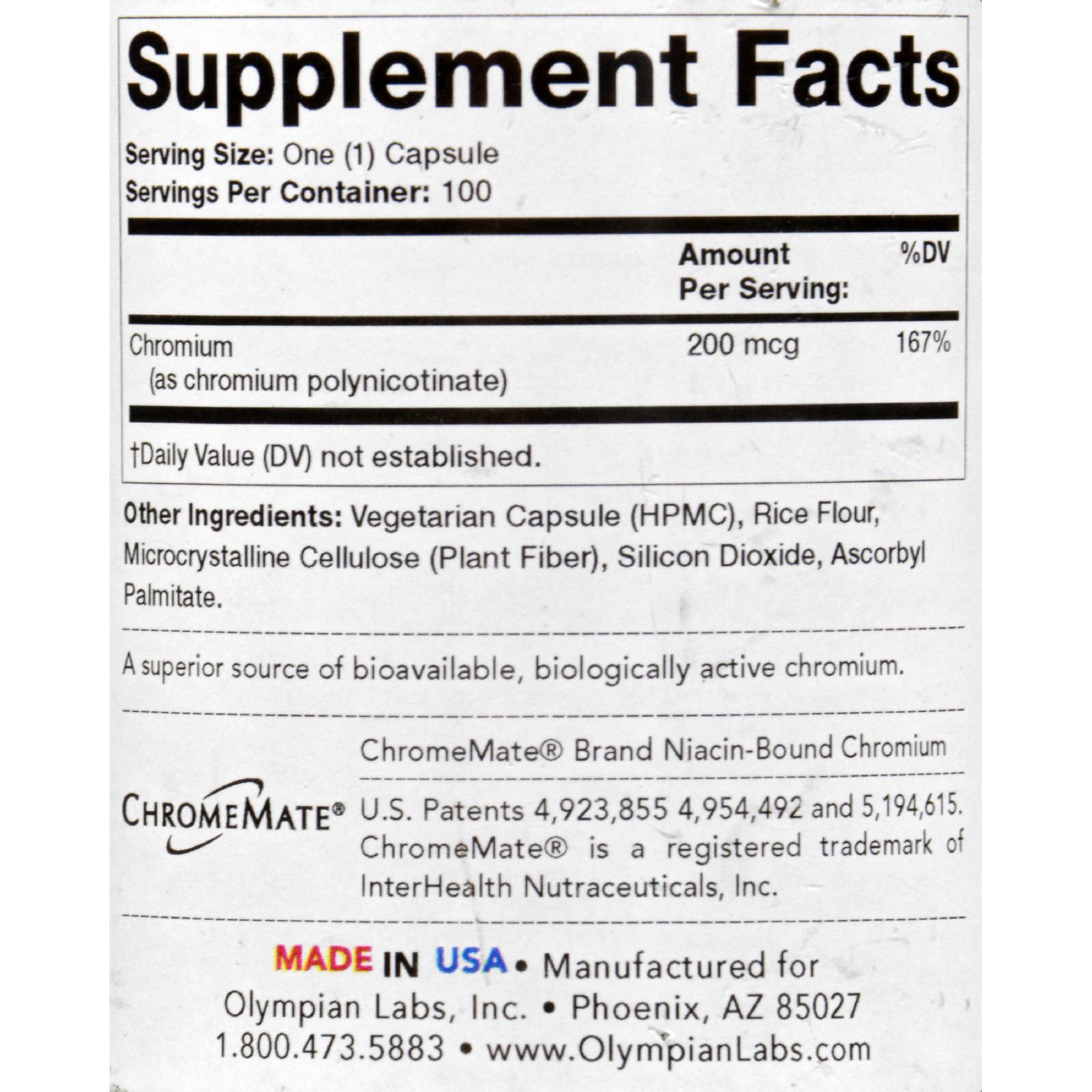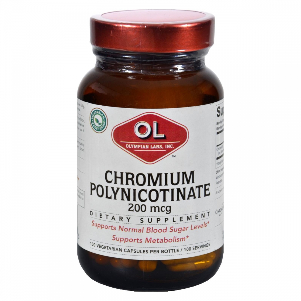 Olympian Labs Chromium Polynicotinate is made with ChromeMate, a patented biologically active oxygen-coordinated niacin-bound chromium complex. It works together with insulin as a part of the body's natural function for regulating glucose metabolism. Insulin depends on chromium to help move Sugar Glucose and fat into the bodys cells where nutrients are either burned for fuel or stored. An independent athlete-based study reported that six weeks of chromium supplementation significantly increased lean body mass and decreased body fat.
