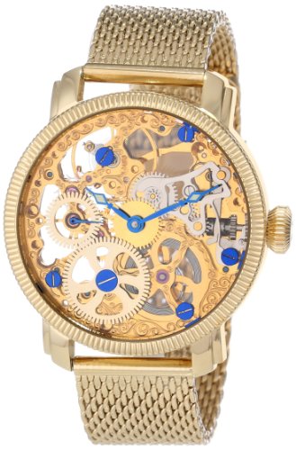 -. Feature : Watch features a gold-tone case and bracelet / Mechanical movement / Blue hour minute and second hands / Gold-tone skeleton dial / Water resistant to 99 feet (30 M): withstands rain and splashes of water, but not showering or submersion