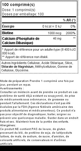Suggested Use As a dietary supplement Take 1 tablet, one time daily, with a meal - Or as directed by your healthcare professional. Supplement FactsServing Size: 1 TabletServings Per Container: 100Amount Per Serving% Daily Value***Biotin1000 mcg333�lcium (from Dibasic Calcium Phosphate)46 mg5% ***Percent Daily Values are based on a 2,000 calorie diet
