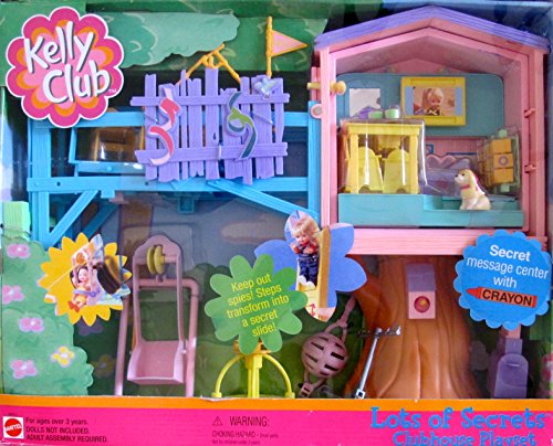 -. Feature : Kelly Club Lots of Secrets Clubhouse Playset is a 2001 Mattel production. See MORE DETAILS Below in PRODUCT DESCRIPTION. / CONTENTS: Clubhouse, Chairs, Scooter, Slide/Staircase, Working Tic Tac Toe Game (Removable), Tea Pot & Cups, Mini Stationary Set w/Crayon, Rub Plate Icons & Icon Holder (Toy Box), Mailbox w/Pop Up Flag, Mylar Mirror & Comb, Secret Picture Frame, Helmet, Bunk Beds, Folding Ladder, Secret Table that Flips, Cable Ride, Merry-Go Round, Sculpted Puppy & 2 Pretend Cans of Coca Cola. / ADULT ASSEMBLY REQUIRED. Steps transform into a Secret Slide! Secret Message Center w/Bonus Crayon! / Playset intended for Kelly Doll & other 4.5" fashion size Dolls; NO DOLLS are included. All sizes, colors & details may not be exact & may vary. / For Ages 3+ years. *Box approx. 16" x 13" x 3.5". Some shelf wear to packaging only. For Box Condition see CONDITION NOTE or Email Seller for Details.