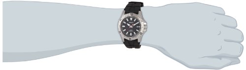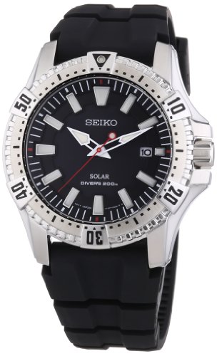 Stainless steel case with a black rubber strap. Uni-directional rotating stainless steel bezel. Black dial with luminous hands and index hour markers. Minute markers around the outer rim. Dial Type: Analog. Luminescent hands and markers. Date display at the 3 o'clock position. Solar quartz movement. Scratch resistant Hardlex crystal. Screw down crown. Solid case back. Case diameter: 44 mm. Case thickness: 12 mm. Round case shape. Band width: 20 mm. Tang clasp. Water resistant at 200 meters / 660 feet. Functions: date, hour, minute, second. Casual watch style. Seiko Solar Black Dial Stainless Steel Mens Watch SNE295Feature
