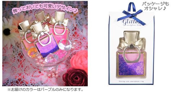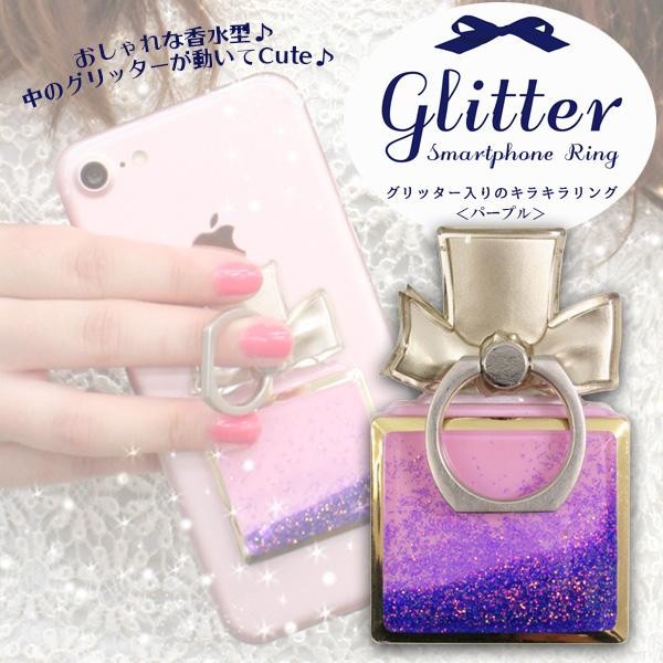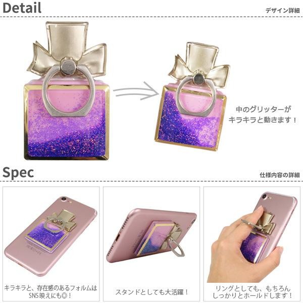 | 中のグリッターが動く、キラキラしたスマートフォンリングです。おしゃれな香水型で、存在感のあるフォルム♪しっかりとした粘着で貼り付き、リングに指を通して使用することで、スマートフォンなどの端末を落下から守ります。 |