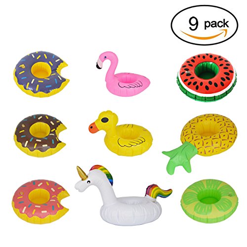 -. Title : Inflatable Drink Holders, HOMEWE 9Packs Drink Floats Fruit Donuts Duck Flamingo Unicorn Cup Holders Pool Floats Bar Party Drink Holder Supply for Pool Party, Bath Time