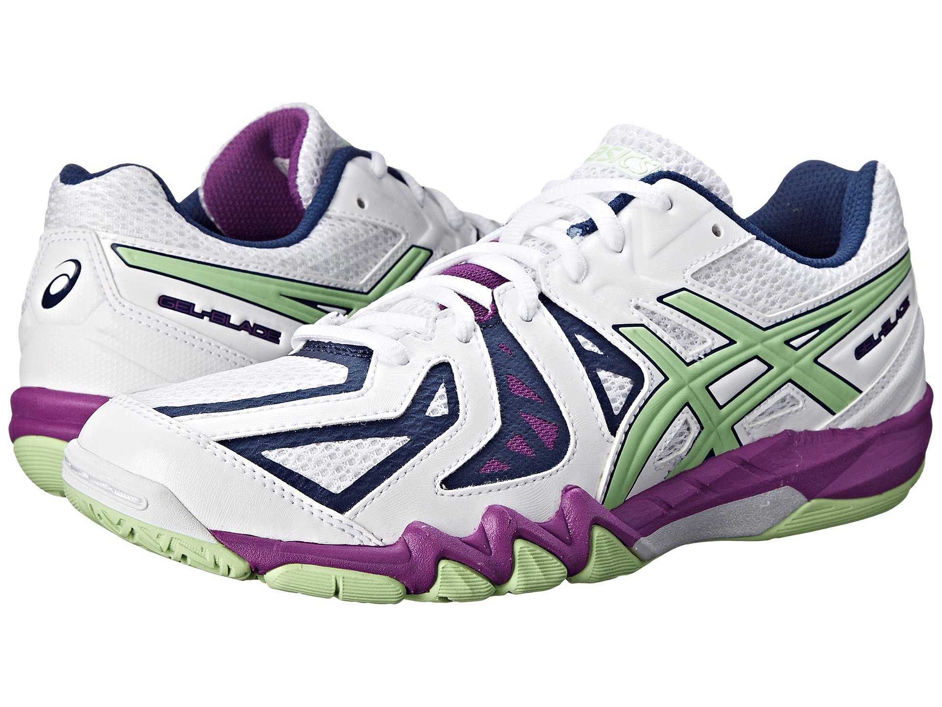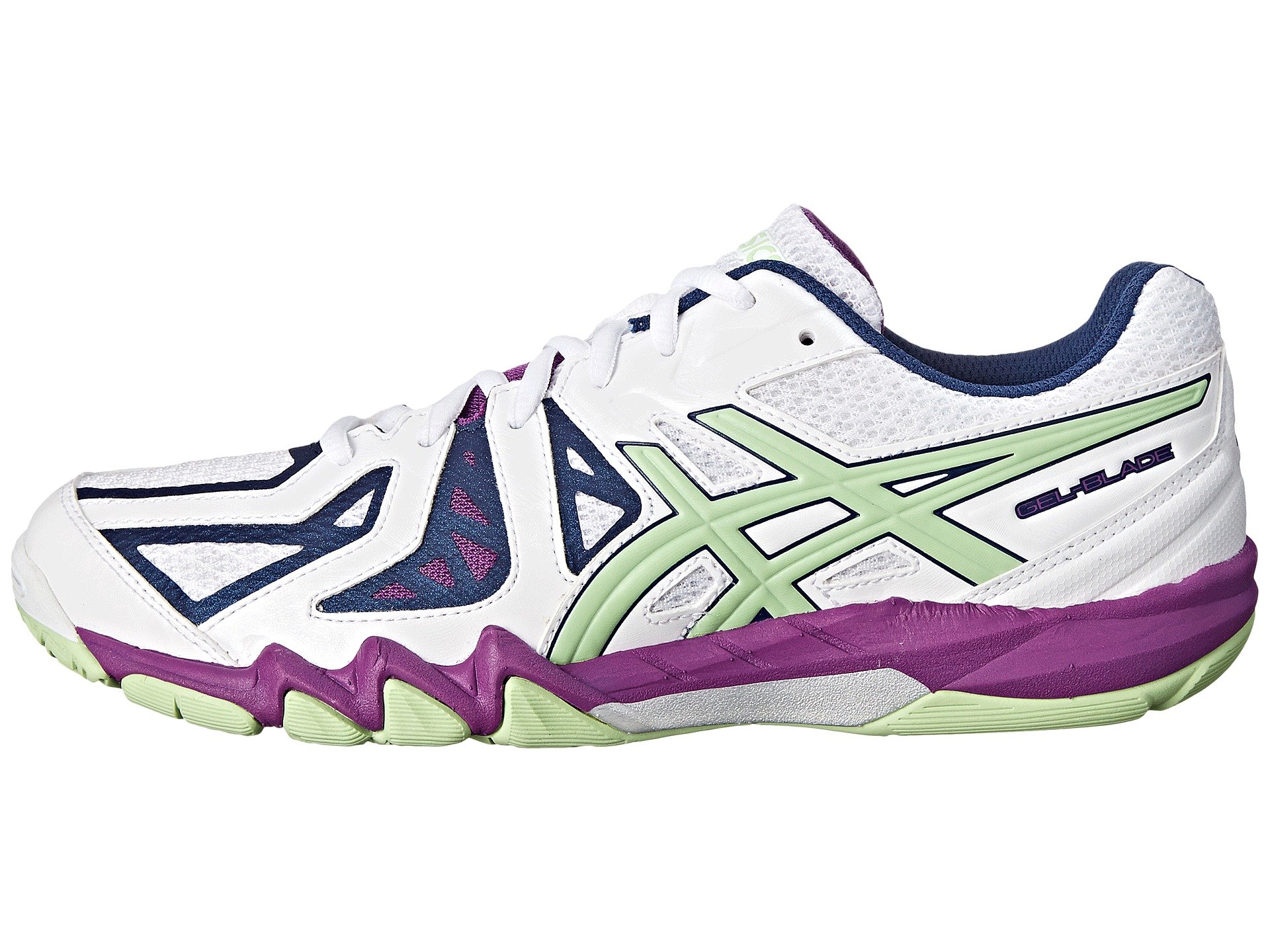 | Product Information SKU: #8545989Smoke the competition in the ASICS? GEL-Blade™ 5 court sneaker!Ideal for squash an other indoor court sports. Breathable mesh and supportive synthetic overlays. Lace-up closure.Lightly padded tongue and collar. Soft fabric lining offers a great in-shoe feel. Molded foam insole. I.G.S? enhances the foot's natural gait from heel strike through toe-off.Rearfoot GEL? cushioning system attenuates impacting shock and allows for a smooth transition to midstance.Trusstic System? technology reduces the overall weight of the shoe without compromising structural integrity. AHAR? rubber outsole delivers long-lasting traction.Imported. Product measurements were taken using size 8.5, width B - Medium. Please note that measurements may vary by size.Weight of footwear is based on a single item, not a pair.Measurements: Weight: 9 oz |