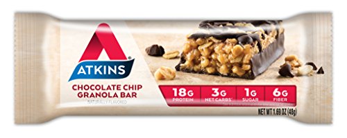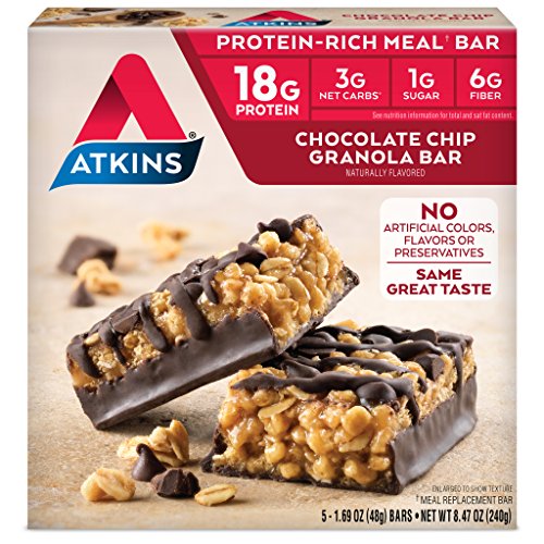 -. Binding : Health and Beauty -. Brand : Atkins -. EAN : 0637480049061 -. Feature : Rich chocolate and crunchy granola bar with a chocolate drizzle. / Only 0g Sugar and 3g Net Carbs per seving / Excellent Source of Protein & Fiber / No added sugar. Great for a low carb lifestyle! / Essential Vitamins and Minerals -. IsAdultProduct : 0 -. IsAutographed : 0 -. IsMemorabilia : 0 -. Label : Atkins -. LegalDisclaimer : Actual product packaging and materials may contain more and different information than what is shown on our website. We recommend that you do not rely solely on the information presented and that you always read labels, warnings, and directions before using or consuming a product. Please see our full disclaimer below. -. Manufacturer : Atkins -. Model : 405659 -. MPN : 405659 -. NumberOfItems : 1 -. PackageQuantity : 1 -. PartNumber : 405659 -. ProductGroup : Health and Beauty -. ProductTypeName : HEALTH_PERSONAL_CARE -. Publisher : Atkins -. Size : 1 -. Studio : Atkins -. Title : Atkins Protein-Rich Meal Bar, Chocolate Chip Granola, 5 Count -. UPC : 797252172417
