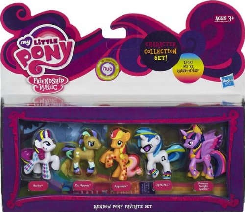 Studio : My Little Pony Publisher : My Little Pony Binding : Toy Product Description It's party time with the Rainbow Pony Favorite Set! Your Dr. Hooves can organize everything while your DJ PON-3 figure sets up the tunes. They'll celebrate with your Rarity, Applejack and Princess Twilight Sparkle figures and their fancy rainbow decorations! It's going to be a real rager with your Rainbow Pony Favorite Set! My Little Pony and all related characters are trademarks of Hasbro. 0