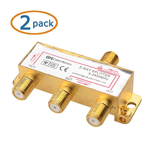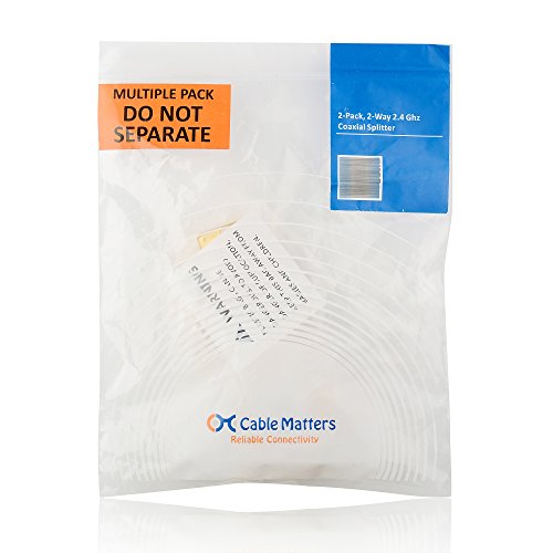 The Cable Matters Gold Plated Coaxial Splitter splits a single incoming coaxial signal from cable television (CATV), VCR, satellite receiver, cable box, or antenna into multiple outgoing signals. Gold plating ensures a corrosion free connection. Convenient and cost effective 2-pack coaxial splitters can be used on different devices.