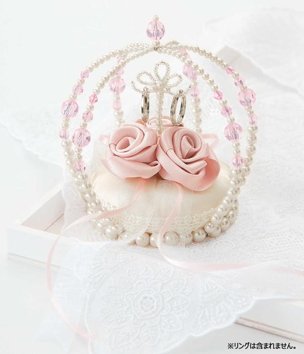 クラウン型のリングピロー。バラを上品にあしらった巻きバラタイプです。 製造国:日本 素材・材質:クラウン部分:パールビーズ 商品サイズ:約11.5×奥行き10×高さ11.5cm ※サプライヤー直送品 ご注文後13~17営業日後の出荷となります【商品名】パナミ ウェディング エターナルリングピロー 巻きバラタイプ ピンク 作品(完成品) WW-123