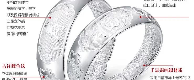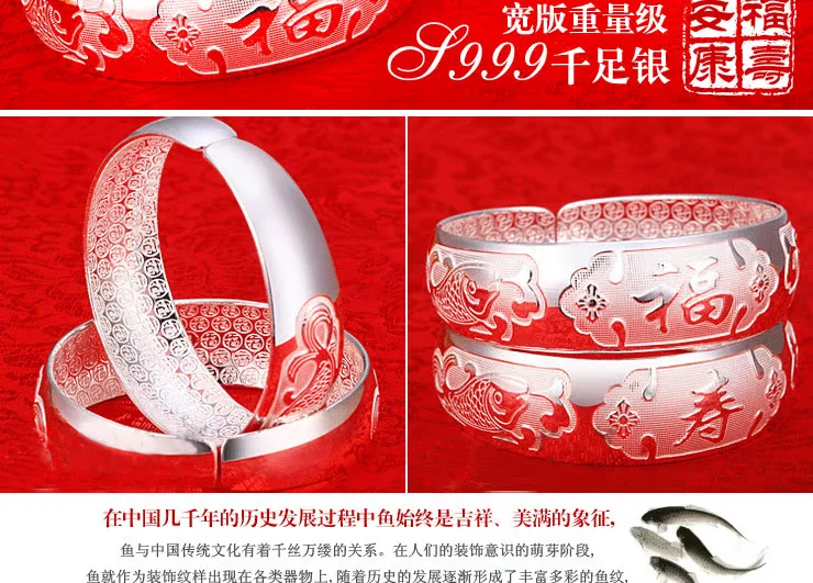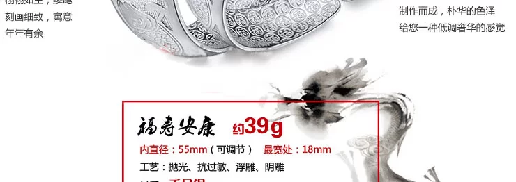 | 材 质 特 性:千足银成色是目前市场上最纯的银子。含银量99.9%,所以从 外 观上很容易识别,就是亮银的本色,质感强烈,比较欢,容易调节大小。越纯 的 银对皮肤汗液的变化 越敏感,特别适用于儿童和女性对身体健康的关注。千足银 收藏价值和黄金一样,可直接兑换人民币,价格也跟随黄金波动,乱世金银。 |