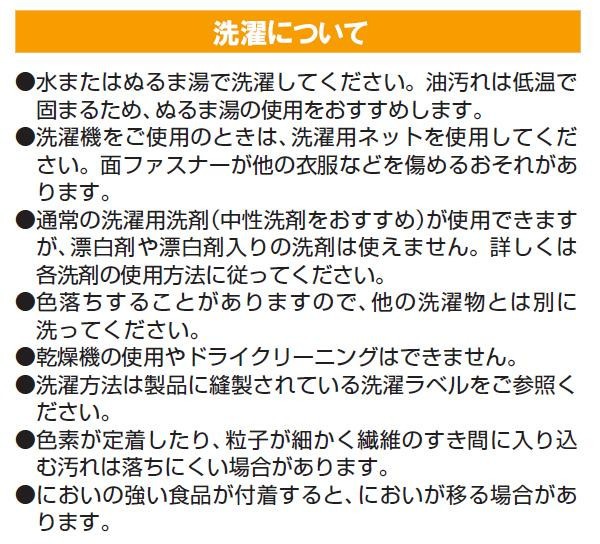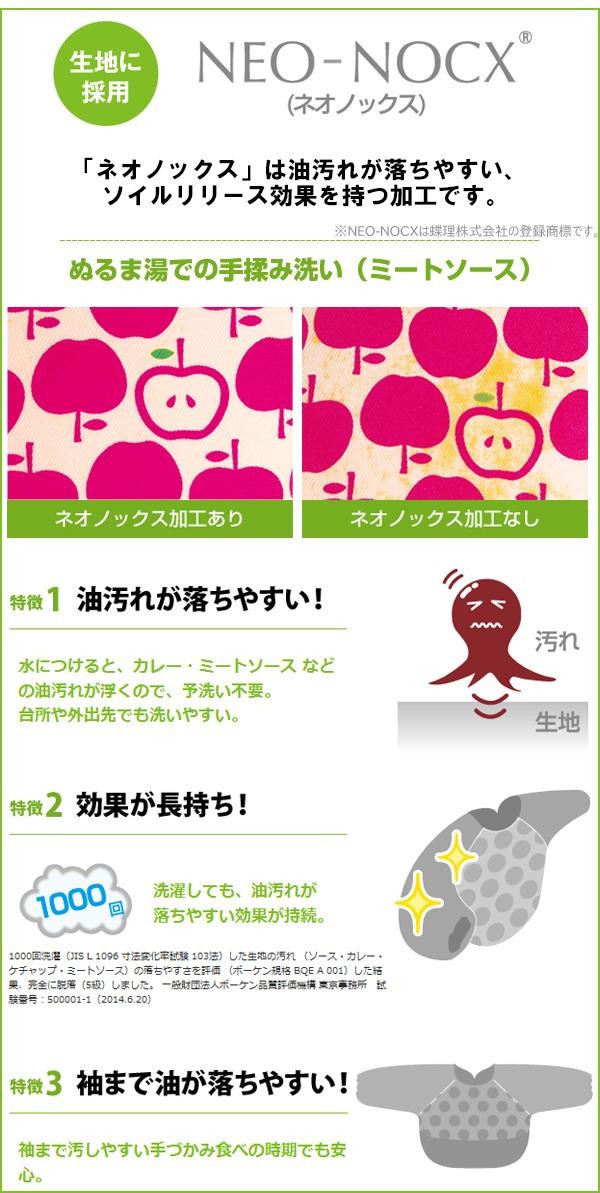 油汚れが落ちやすい特殊加工『NEO-NOCX』で、お洗濯が簡単です。長袖タイプなので、袖までしっかりガード。油が落ちやすい生地とはっ水加工生地の2重構造でお洋服を守ります。 |