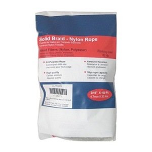 Product DescriptionNylon Rope, Solid Braid, Rope Dia. 3/16 In., Length 100 ft., Working Load Limit 62 lb., Tensile Strength 727 lb., Package Configuration Plastic Bag, Color White0