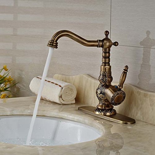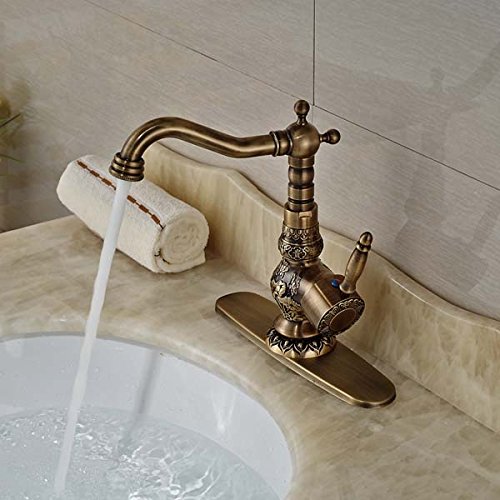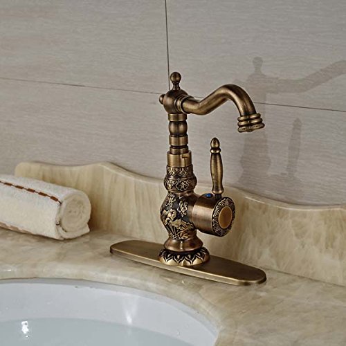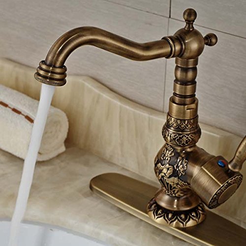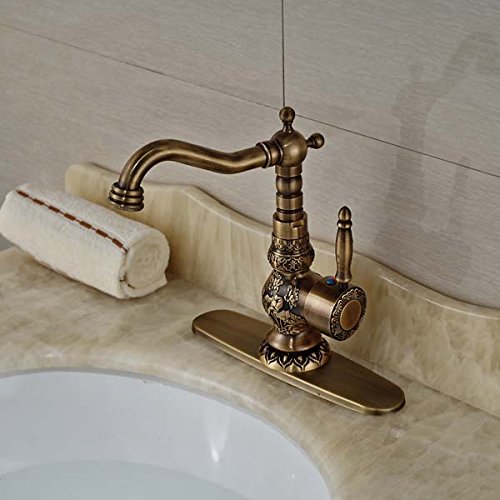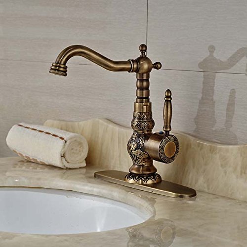 Senlesen Antique Brass Bathroom Faucet Flower Carved Body Vanity Sink Mixer Tap Swivel Spout with Hole Cover Plate