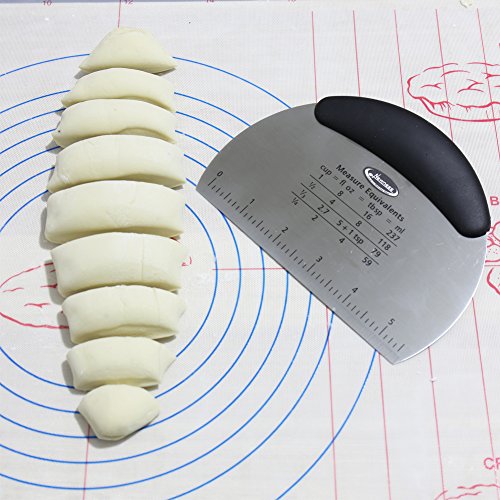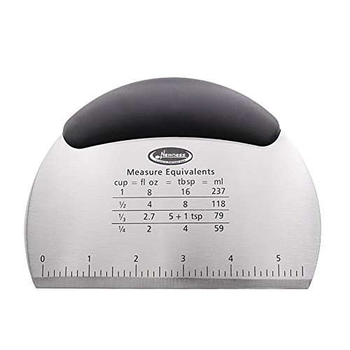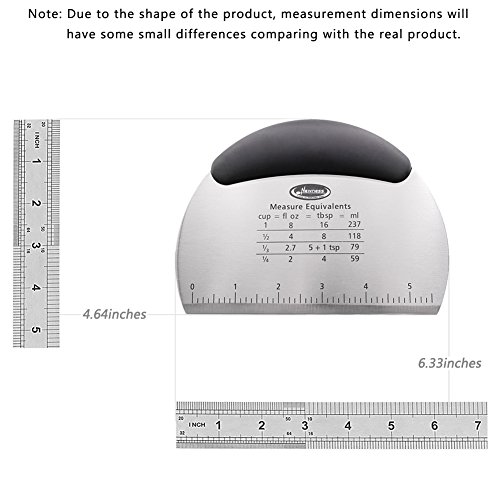 Newness Stainless Steel Scraper with built in Measuring Guide(both inch & cm). Measuring guide(both inch & cm) are listed on the blade for deviding cookie, cake, pizza and pastry dough