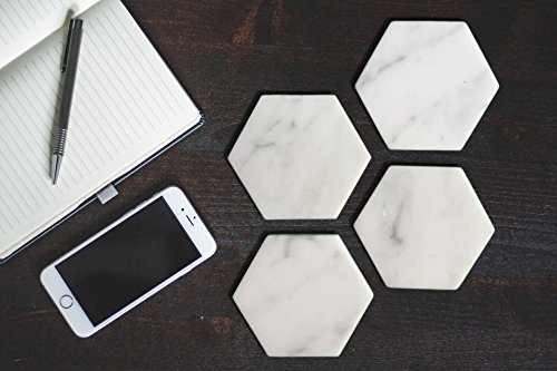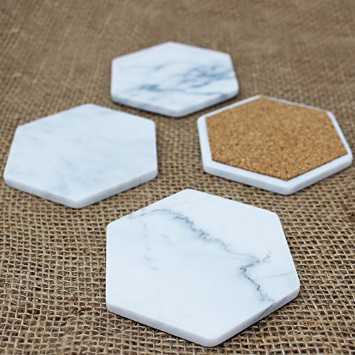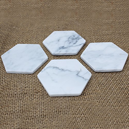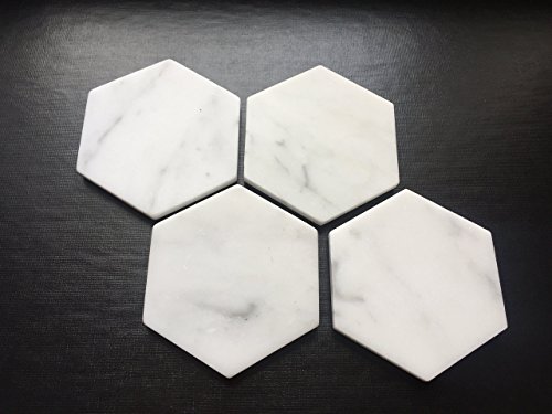 Studio : Marbleobject Publisher : Marbleobject Product Description Great set of Hexagon White Carrara Coasters with Cork Backing. This is for a set of 4 coasters. The coasters measure 4" from point to point and 5/16' thickness. All of our coasters have a cork backing. *Marble is a natural stone, and may contain small fissures/pits/imperfections. These coasters will vary slightly in pattern - no two coasters will look exactly the same 0