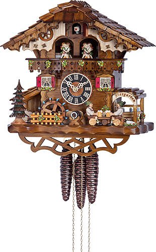 Product Description 35-62-59T This Chalet-styled Cuckoo Clock is designed like a traditonal Biergarten. The beerdrinker, the dancers and the millwheel are moving elements. 0