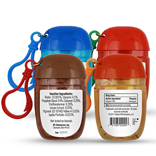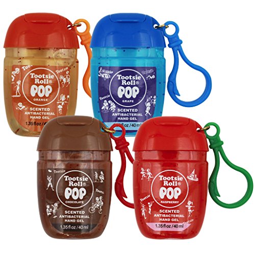 Studio : Just For Laughs Publisher : Just For Laughs Binding : Misc. Product Description Candy scented antibacterial hand gel in Tootsie Roll Pops scents. Clip-on bottle allows you to clip hand sanitizer on your bag, purse or keychain. 1.35 fl oz per bottle. Great for everyday use, or add them to treat bags as a fun party favor. Includes 4 different scents: 1 each of orange, grape, chocolate and raspberry. 0
