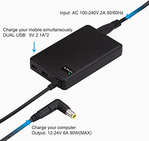 LVSUN Universal Laptop Charger 90W 12-24V One for All - Slim AC Adapter Power Supply Cord with Dual USB Ports for Mobile/Tablet - Compatible with Lenovo HP Toshiba Samsung Acer Asus and Most Notebooks
