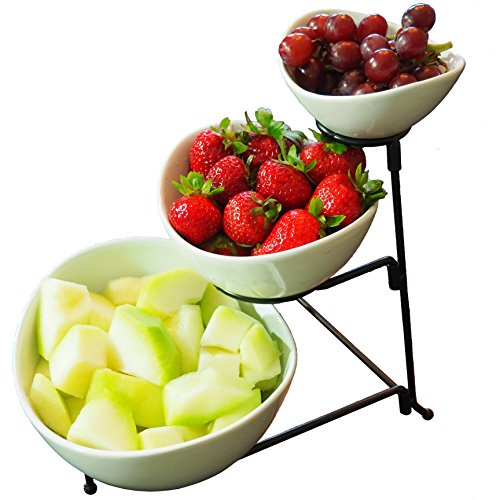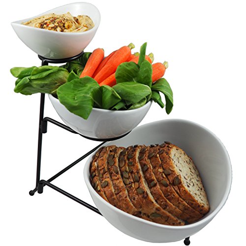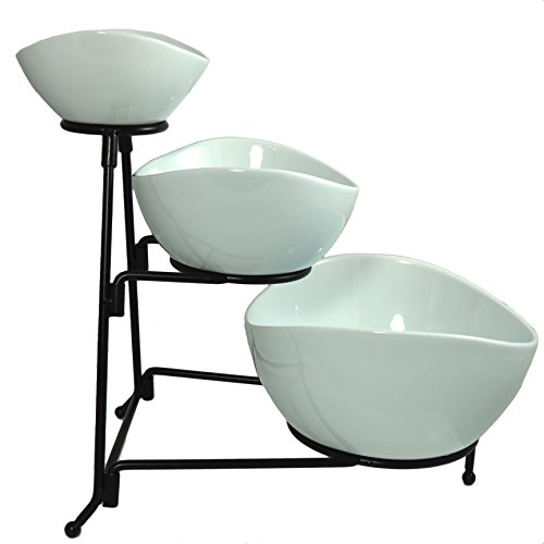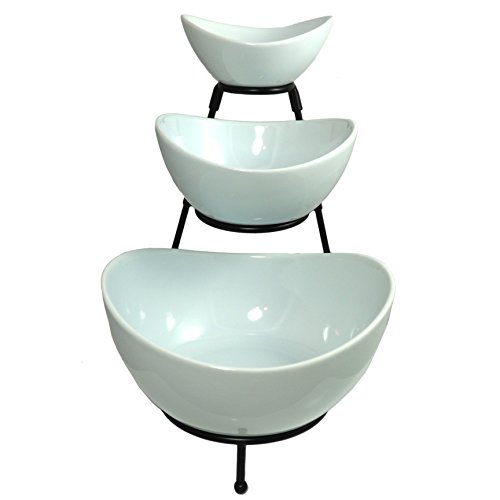 Studio : Chef's Medal Publisher : Chef's Medal Product Description With 3 chic stoneware bowls classic black metal stand, your 3-tiered Serving Bowl Set is stylish sturdy. Count on it to add an elegant touch to parties, showers, receptions, buffets, dinners everyday! Why settle for flimsy serving stands that shake, rattle roll, with cheaply made bowls that can slip, crack shatter? Your Chef's Medal Food Serving Bowl Set provides superior durability, thanks to: ? Sturdier stoneware bowls, specially made to resist breakage ? Stronger metal stand measuring 6.5mm (not 5mm like most) Result? A more stable food stand - no more wobbling or buckling. Even the packaging is more durable, to help protect your bowls during shipping! Perfect Way to Display Serve Party Foods The oval bowls range in size to accommodate your needs, with curved sides to help prevent messy spills. Fill the bowls with everything from appetizers to desserts... then arrange on the 3-tier stand. So convenient for your guests! Plus, it instantly enhances your decor. Ideal for Everyday, Too Load up your serving stand with fruits veggies and set on your kitchen counter. OR use the bowls separately to serve dinner entrees sides. Easy to Clean Store These food-grade serving bowls are safe for the oven, microwave dishwasher. The metal stand washes easily by hand. When you're finished, simply disassemble the stand for storage in a drawer or cabinet. Money-Back Guarantee Limited Warranty, So Add to Cart Risk Free! Plus, be sure to get extras for all the folks on your gift list. 0