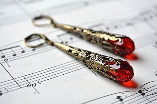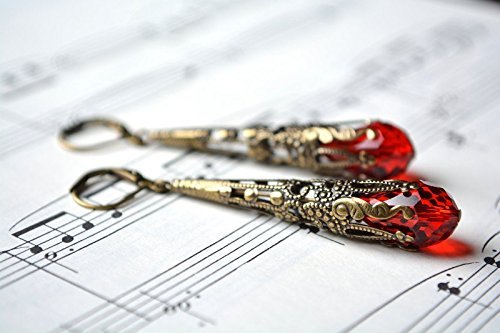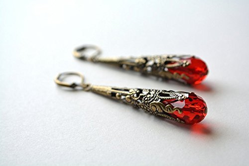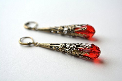 -. Title : Red Dangle Earrings Vintage Style Earrings Antiqued Brass Filigree Long Dangle Earrings Leverback Victorian