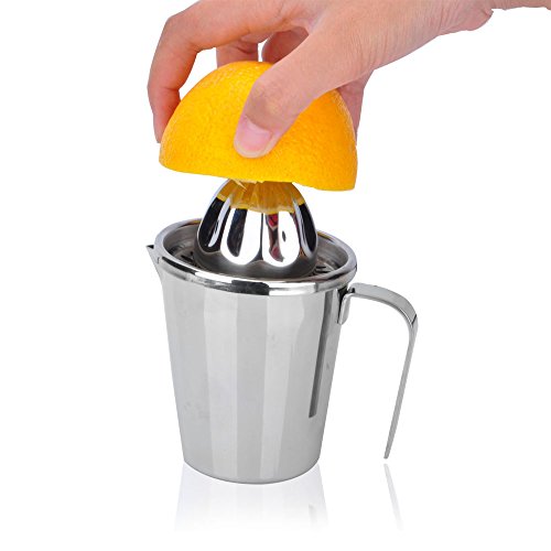 -. Feature : Feature ------ portable designation like a cup, easy to squeeze lemon/line/orange, the juice will go into cup directly, manual juicer can keep orginal taste of fruit better. Food grade 304 stainless steel is more durable usage and good for health; / Function ------ make fruit juice by manual / aterial ------ food grade 304 stainless steel / Product Size/Weight ------ 8.5*6*13cm/229g / Color ------ stainless steel color