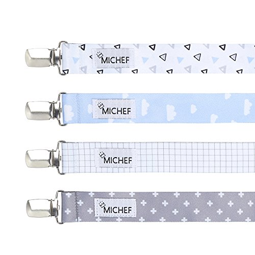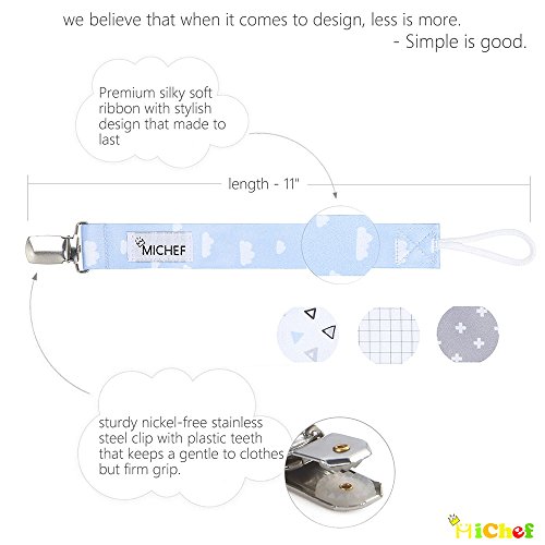 -. Feature : ✓ UNIVERSAL FIT - Our pacifier clips have a universal loop attachment that keeps your favorite brand of pacifier with your baby. Easily attach to Pacifiers, Soothies, Baby Bibs, Teething Toys and Toddler Blankets. / ✓ STYLISH & FUNCTION - Modern design with adorable patterns and gender neutral colors for both baby boys and girls to compliment your baby's cute outfits. Reduces the risk of your baby's pacifier with all sorts of nasty germ. No more dropping or losing your precious soothers. No more cleaning the pacifier. / ✓ HIGH QUALITY - Premium silky soft ribbon that colors will not bleed. Sturdy nontoxic metal clip keeps a gentle to clothes but firm grip. Free of lead, nickel. Without any sharp edges, No rusting and No small metal pieces. / ✓ PERFECT BABY SHOWER GIFT - All experienced parents know how useful it was. Make the best gift for new parents, baby showers, or for any excuse to make a baby look amazing. / ✓ 100% Super Quality Guarantee: MiChef Accept Unconditional Free Return in 60 days. Add our Pacifier Holder Clips to your cart today and order with confidence!