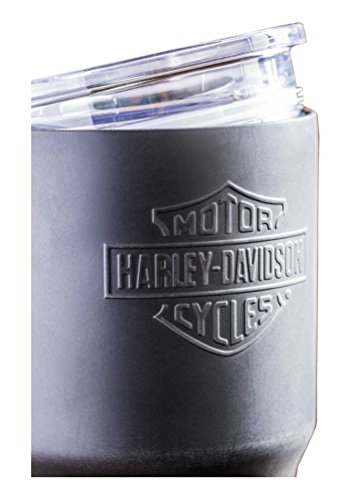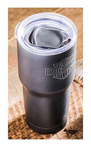 Harley-Davidson® The Perfect Travel Cup, 3SSB4900. This stainless steel design is the cure to the standard coffee cup. Features a classic embossed Bar & Shield logo. This cup holds 24 ounces and has a sleek shape with straight lines that allow it to fit into any car cup-holder. Double wall Stainless Steel construction with a Tritan lid that doesn't spill or leak. Keeps beverages cold up to 9 hours and hot up to 6 hours. Dishwasher and microwave safe. Size: 24 oz. 4" W x 3" D x 8" H.Feature