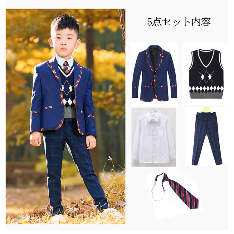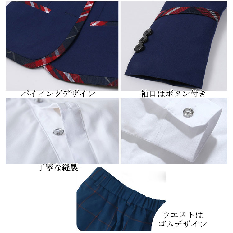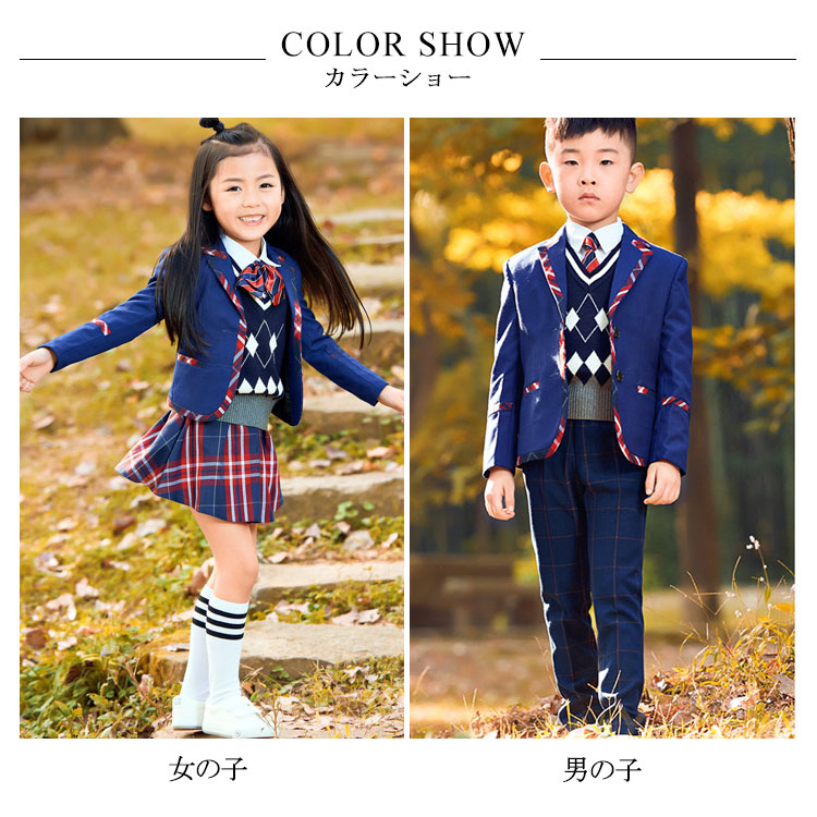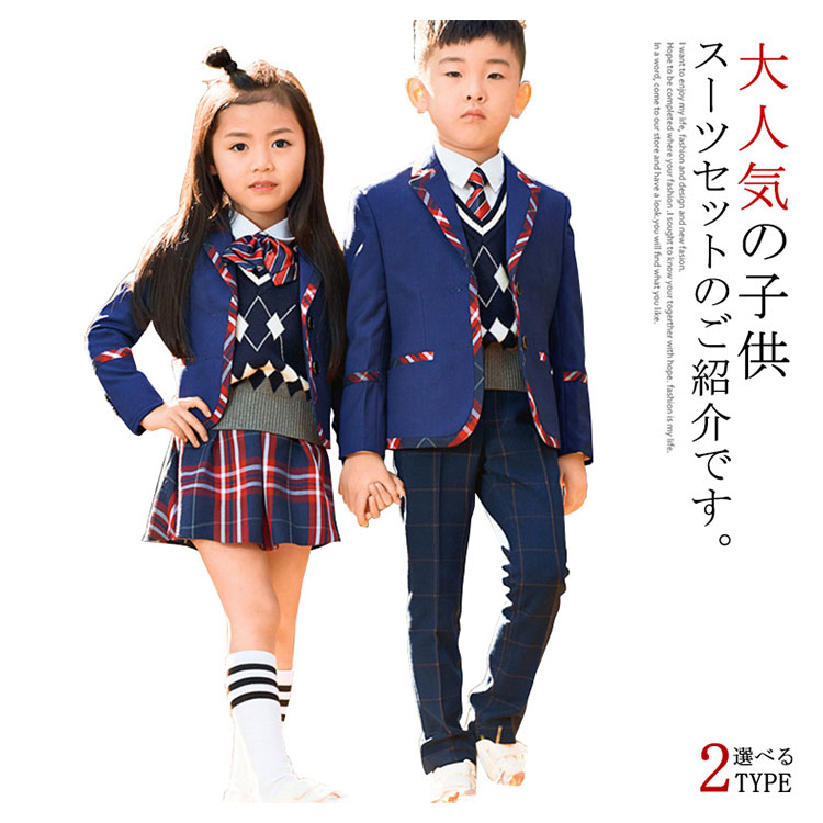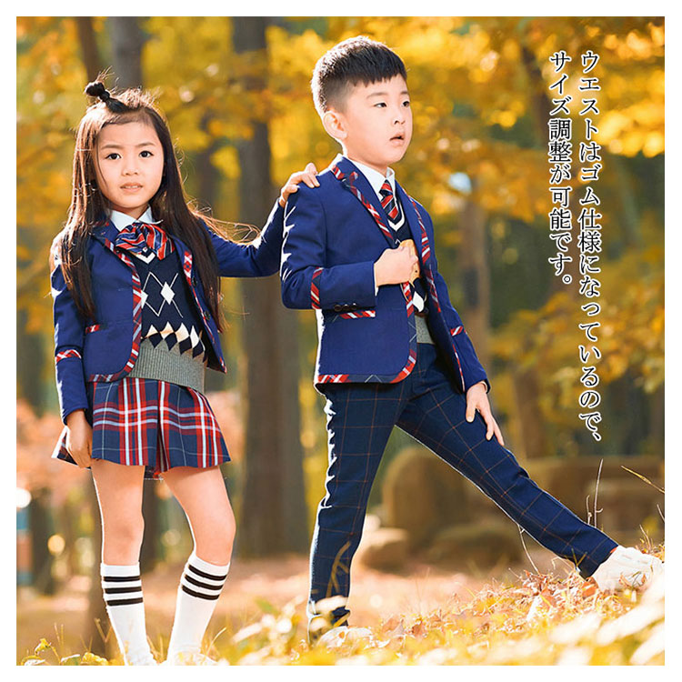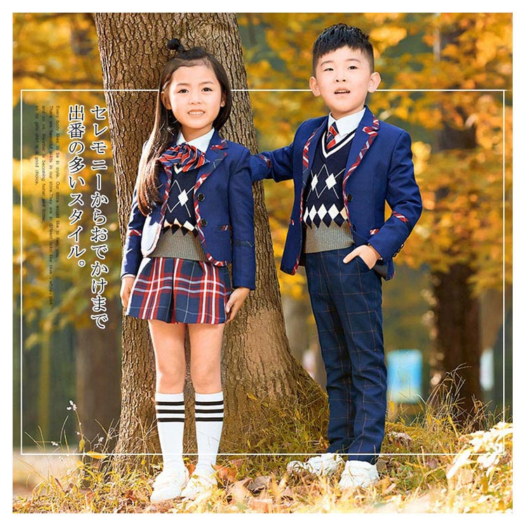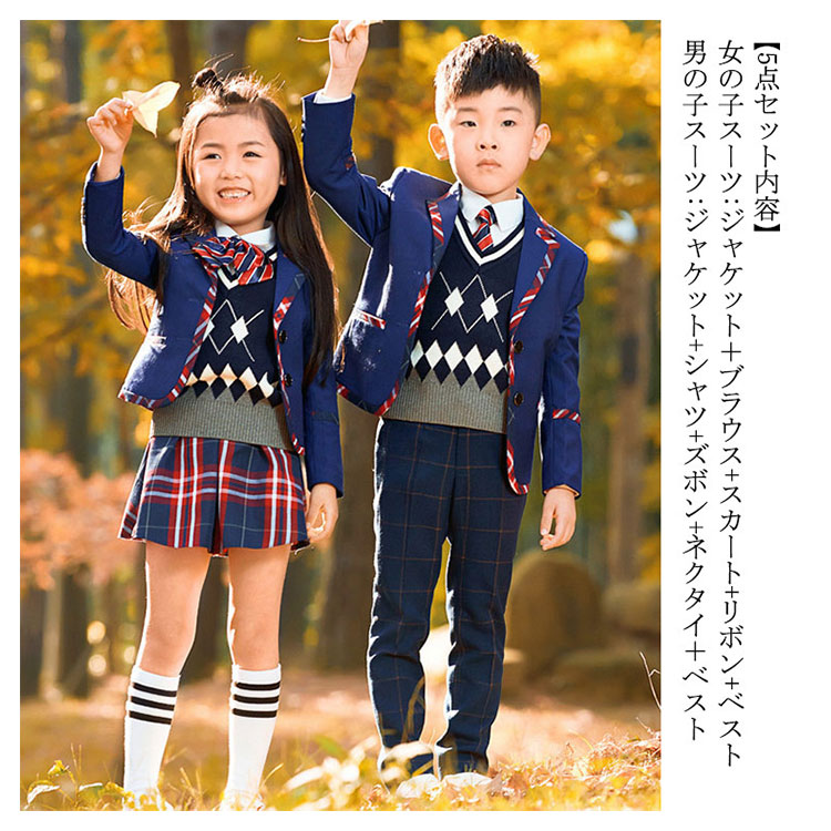 | 【5点セット内容】女の子スーツ:ジャケット+ブラウス+スカート+リボン+ベスト、男の子スーツ:ジャケット+シャツ+ズボン+ネクタイ+ベスト大人気の子供スーツセットのご紹介です。上品なチェックはカジュアルアップ出来、着回し力抜群です。セレモニーからおでかけまで出番の多いスタイル。ウエストはゴム仕様になっているので、サイズ調整が可能です。 | |