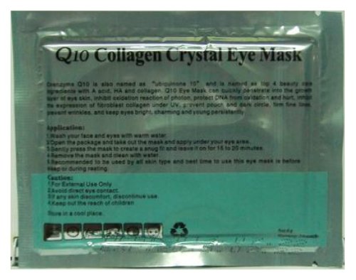 - Feature : Pearl Whitening Q10 Crystal Collagen Eye Mask / Coenzyme Q10 is also named as ""ubiquinone10"" and is named as top 4 beauty care ingredients with A acid , HA and collagen. Q10 eye mask can quickly penetrate into the growth layer of eye skin / inhibit oxidation reaction of photon, protect DNA from oxidation and hurt , inhibit the expression of fibroblast collagen under UV, prevent pouch and dark circle, firm find lines, prevent wrinkles, and keep eyes bright, charming and young persistently / Ingredient:Water,Glycerin,Polyvinyl Alcohol,Sodium Polyacrylate,Tartaricacid,Grape seed oil,Retinyl palmitate Tocophbryl acetate VE,BHT,Methylparaben,Fragaben,Fragrance,Aloe and Green Tea Extract / Package included: 30 pars (60 pcs) eye mask (Notice: the pack surface maybe not same as in the picture, but same function, please don't worry. )