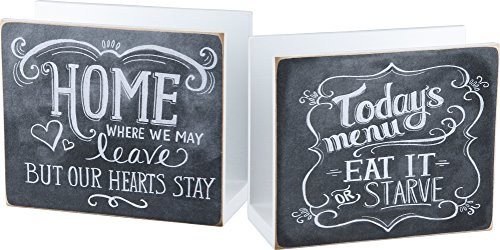 -. Brand : Primitives By Kathy -. EAN : 0883504245265 -. Feature : Napkin Holder / Reads: "HOME where we may leave but our hearts stay" and " "Today's menu eat it or starve" / Beautiful White Lettering / From Primitives by Kathy / 6" x 2.25" x 5" -. Model : 24526 -. PackageQuantity : 1 -. ProductGroup : Kitchen -. ProductTypeName : KITCHEN -. Title : Napkin Holder from Primitives by Kathy -. UPC : 883504245265
