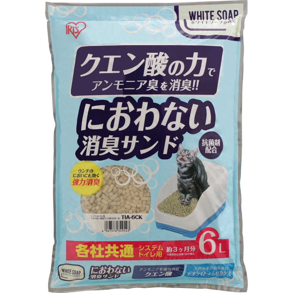 【本体サイズ (幅X奥行X高さ)】 :40×8×24cm 【商品説明】:クエン酸、ゼオライト、シリカゲルの3つの消臭素材でがっちり消臭。 固まらないタイプのシステムトイレ用猫砂です。 クエン酸がアンモニアを中和し、においと雑菌の繁殖を抑えます。 ゼオライトとシリカゲルでアンモニア臭を吸着し、湿気を吸収するので、トイレ内の消臭乾燥に活躍。 強力な脱臭力と抗菌力で約1ヵ月交換不要。(目安) ホワイトソープの香り付き。 【におわない消臭サンド】:システム猫トイレ専用、固まらない猫砂。 クエン酸の力でアンモニアを中和し、長時間がっちり消臭。 【長時間の脱臭力】:アンモニアを中和し、ニオイと雑菌の繁殖を抑えるクエン酸と、ニオイを吸着するゼオライト。消臭乾燥に活躍するシリカゲルの3つの消臭剤ががっちり消臭。 猫砂の目に見えない小さな穴がニオイ成分を吸着し、長時間脱臭効果が続く。 【脱臭率検証グラフ】:脱臭率99.9%が24時間継続するから、帰宅後のニオイが気にならない。 (容量27Lの密閉された容器内で、1kgの猫砂に濃度1%のアンモニア水溶液を滴下し一定時間後のアンモニア濃度から脱臭率を測定) 【1ヵ月交換不要でお掃除手間いらず】:強力な脱臭力と抗菌力が長く続くので、約1ヵ月交換不要。 1袋で約3か月分。 ※標準的な成猫1匹で使用した場合の目安。 【飛び散りにくく、粉立ちも少ない】:大きめの粒で肉球に挟まりにくい。 飛び散りや粉立ちが少なく、掃除が簡単。 【ホワイトソープの香り付き】:ペットも人も好むホワイトソープの優しい香り付き。