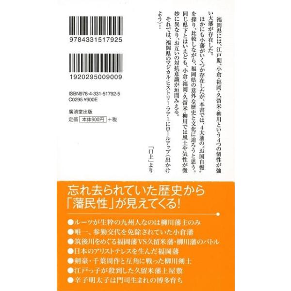 【商品説明】 定価(税込み):972円 値引き:5% OFF 現在の福岡県は、かつて複数の藩から成り立っていた。当然、それぞれにお国柄も異なり、それは現在でも受け継がれている。本書では、小倉・福岡・久留米・柳川という4大藩を、歴史・人物・文化・グルメなどの切り口で比較するかつてない藩対決スタイルの福岡県史。忘れ去られていた小さな歴史から「藩民性」が見えてくる! バーゲンブック 新品 特価 格安 歴史 地理 文化 民族 風習 グルメ | |