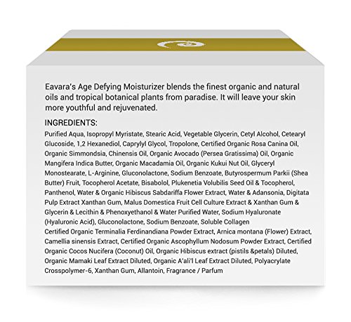 -. Feature : CERTIFIED ORGANIC - Eavara's ORGANIC SKIN CARE PRODUCTS have Botanical Ingredients have been clinically shown to aid in the reduction of fine lines and wrinkles. Try EAVARA'S Anti Aging Products RISK FREE - Eavara is proud to Guarentee that No Matter when you buy our product, if you are unsatisfied, just contact us for a refund! / AGE DEFYING BENEFITS - Eavara's unique Age Defying Moisturizer combines the Best of SCIENCE and NATURE / EAVARA'S ORGANIC BOTANICAL INGREDIENTS and nutrient-rich formula WILL PROVIDE YOU with radiant, youthful-looking skin. These botanical properties give Eavara's Moisturizer its gentle citrus scent. They are reported to have natural antioxidant and anti-bacterial properties. Ancients believed one of Eavara's ingredients called Plumeria to be the "Tree of Life" due to its healing qualities. / NO PARABENS - Eavara believes in providing the best skin care products possible. Our products are proudly free of animal testing, animal by-products, parabens, propylene glycol, sodium lauryl sulfates, Phthalates, harmful colorants and fragrances, mineral oils, petroleum, and other harsh cosmetic chemicals. Our Skin Care Products are scientifically formulated in a state-of-the-art facility. Our moisturizer sells out fast so click the button at the top of this page to Buy Now! / If you're not satisfied, just contact Eavara for a refund. Email us through Amazon with any questions.