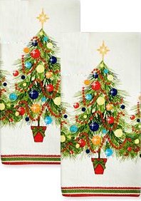-. Feature : Set of 2 colorful Fiesta kitchen towels with inside corner tab for easy hanging / Cream color towel with colorful tree, sparkling ornaments, and garland; red and green accent edge stripes / Each towel measures 16 inches by 28 inches and is 100% cotton; machine wash cold, tumble dry low / Durable and soft cotton velour construction ensures lasting quality; bright colors resist fading, wash after wash / The colorful towels are sure to brighten up any holiday kitchen!