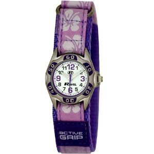 Girl'S Funky Velcro Watch Round Polished Chrome Sports Case Featuring A Imitation Top Ring. White Dial With Black/Lilac Printed Numbers. Silver And White Luminous Hands With Lilac Second Hand. Lilac Nylon Strap Featuring A Stylish Hibiscus Pattern And A Purple Active Grip Badge. Quality Quartz Movement. Packaging: Transparent Perspex Hanger.