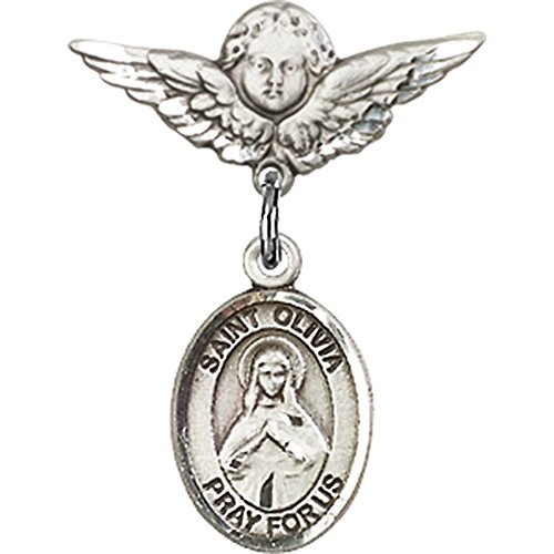 -. Title : Sterling Silver Baby Badge with St. Olivia Charm and Angel w/Wings Badge Pin 7/8 X 3/4 inches