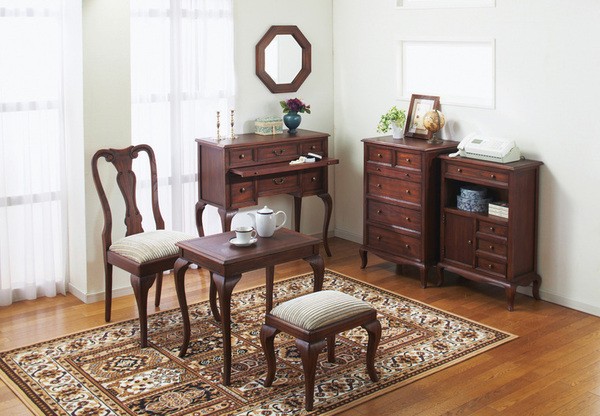英国スタイルのアンティーク調デザイン。木目の優しさを生かしたデザイン。お部屋の一角をエレガントなデスクスペースに演出。パソコンデスクや玄関先の飾り棚としても。