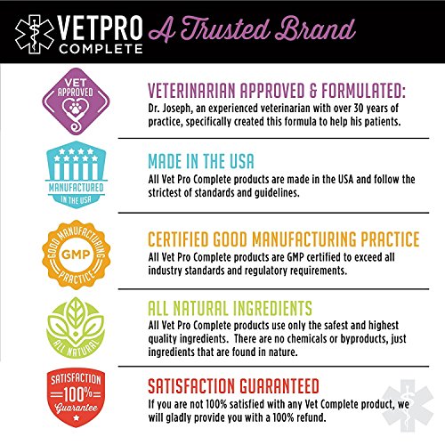 -. Feature : VETERINARIAN FORMULATED - Formulated by Dr. Joseph, a veterinarian with over 30 years of experience relieving his patients from painful arthritis, joint damage, and hip dysplasia. This unique formula's benefits also provides the key nutrients needed for heart, skin, coat, digestive, and liver health. / JOINT & CARTILAGE HEALTH - One of the most common injuries for dogs and cats involves their joints and the tissue surrounding it. To reduce costly vet visits, arthritis medications, or surgeries VetPro uses 1000mg of Glucosamine HCI and 200mg of Chondroitin in each dosage to keep joints flexible, lubricated, and to assist with the rebuilding of damaged tissue. / RELIEF FROM INFLAMMATION - If your dogs or cats love to play then they'll likely end up with painful swelling in their joints or paws. VetPro Complete uses natural turmeric root powder to reduce inflammation in your pet so they can rest comfortably after a rough day at the dog park. / CARDIOVASCULAR HEALTH - Having a healthy heart and cardiovascular system is critical for your four legged friends well being long term. Omega-3 fatty acids are used to promote a healthy heart which in turn improves your pets skin and coat while also warding off serious heart conditions. / TASTY, NATURAL INGREDIENTS - Available in 60 and 120 chicken flavored chews that are shaped just like a dog bone so you can replace non-nutritional treats with a taste tested, beneficial dog biscuit. All VetPro chews are made from all-natural ingredients in the USA in a Good Manufacturing Practice (GMP) certified process.