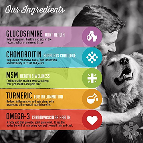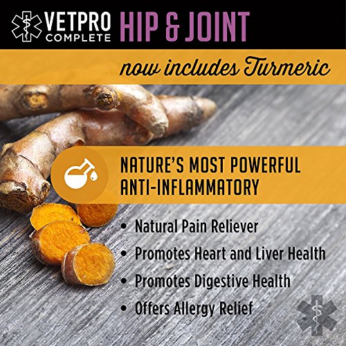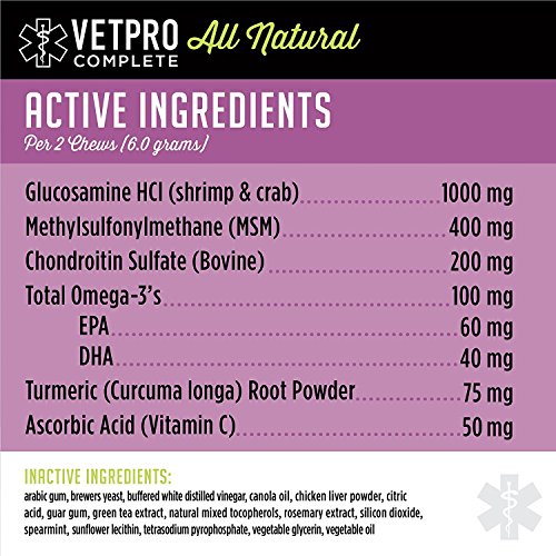 -. Title : VetPro Natural Hip and Joint Supplements For Dogs with Glucosamine, Chondroitin, MSM, Turmeric, Vitamin C, and Omega-3, Chicken Flavored Soft Chews