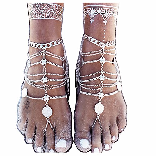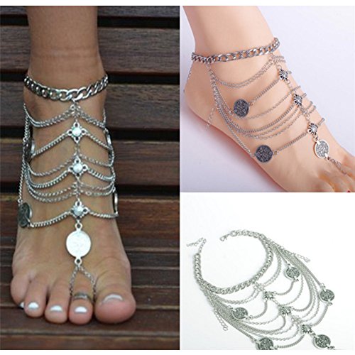 -. Title : Summer Boho Beach Vintage Silver Plated Coin Blessing Symbol Tassel Anklets Swimming Foot Jewelry for Women|EVERRICH
