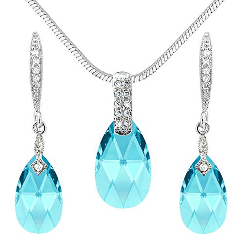 -. Binding : Jewelry -. Brand : Crystal Elegance UK -. Department : womens -. Feature : Pendant chain measures approximately 40cm and is adjustable. / Aquamarine shade colour pendant crystal measures 2cm x 1.5 approx. Earring crystals are smaller (1.5cm x 1.5cm) / Earrings have a drop down length of 4cm (from top to bottom). / Elegant silver tone and made using the finest Swaroski Crystal Elements range crystals. / Comes in a black and gold gift box with velvet lining. -. Label : Crystal Elegance UK -. Manufacturer : Crystal Elegance UK -. Model : amberdrops1set -. MPN : amberdrops1set -. PartNumber : amberdrops1set -. ProductGroup : Jewelry -. ProductTypeName : FASHIONNECKLACEBRACELETANKLET -. Publisher : Crystal Elegance UK -. Studio : Crystal Elegance UK -. Title : Aquamarine Color Crystal Pear Drops Jewelry Set - Swarovski Elements - Necklace and Earrings - Silver Tone - Christmas Gift For Her