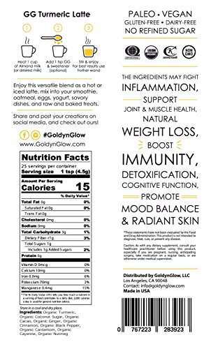 Studio : Starwest Botanical Inc Publisher : Starwest Botanical Inc Binding : Misc. Product Description Organic Turmeric Superfood Blend with Cacao - 100% Organic, Gluten Free, Vegan and Paleo Friendly Instant Mix for Golden Milk, Turmeric Mocha Latte, Smoothie, Tea, Baked and Raw Treats. Just add a teaspoon to almond milk (or any milk you like) and enjoy the revitalizing and inflammation-fighting benefits of this golden adaptogen any time, any where. Follow us on instagram for healthy and delicious recipes daily and share yours with us. 0
