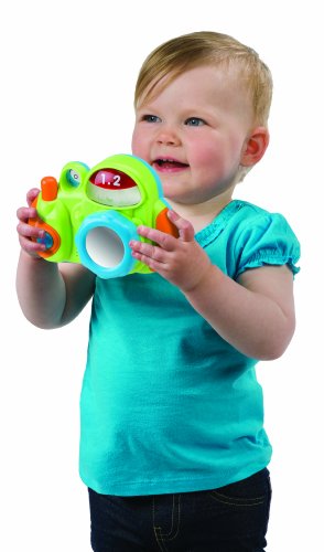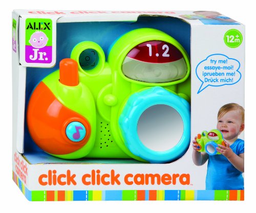 ALEX Jr. Click Click Camera is the perfect camera for baby! Plays 6 melodies, pictures change, lights and music entertain, plus the front lens mirror lets baby practice taking selfies. Camera features real clicks, music, sounds and a ‘flash’ on top. When your child snaps a picture, one of four happy faces pop up with a giggling, happy sound. Requires 3 AAA batteries, included.Feature