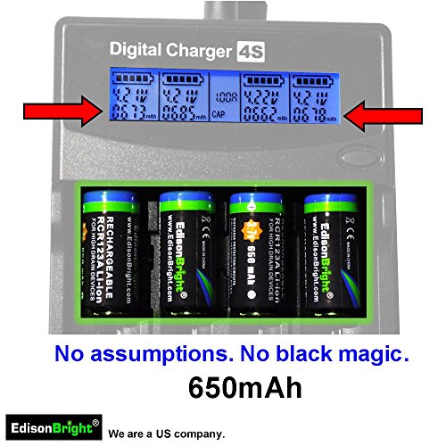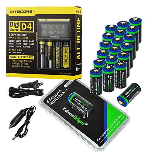 20 Pack EdisonBright type 16340 rechargeable CR123A RCR123A EBR65 3.7v protected li-ion batteries with Nitecore D4 smart digital battery charger digicharger for home & car bundle