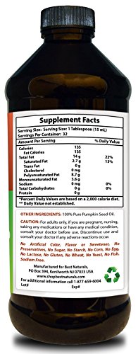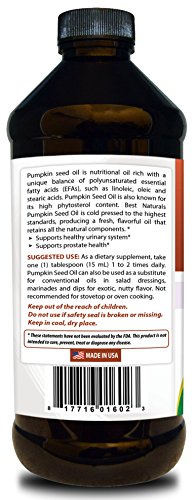 Pumpkin Seed Oil is a nutritional oil rich in essential fatty acids (EFAs). Pumpkin Seed Oil is also known for its high phytosterol content. Best Naturals Pumpkin Seed Oil is unrefined, cold pressed without the use of solvents, and derived only from the highest quality pumpkin seeds.