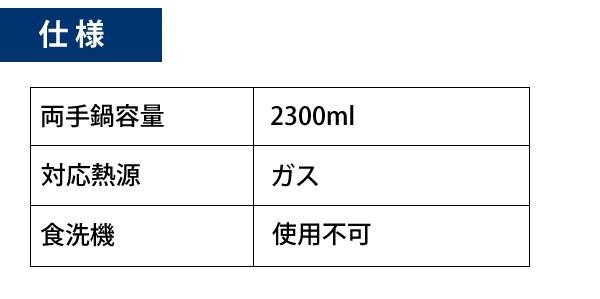 | 仕様 | 両手鍋容量:2300ml 対応熱源:ガス 食洗機:使用不可 |