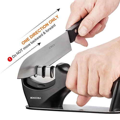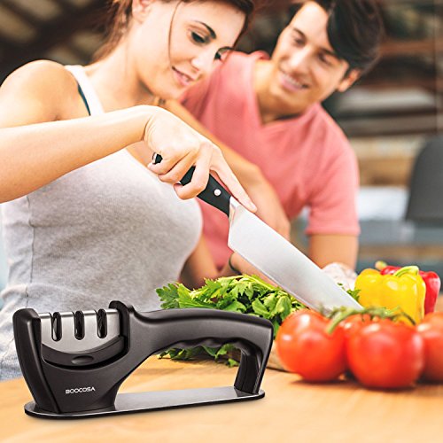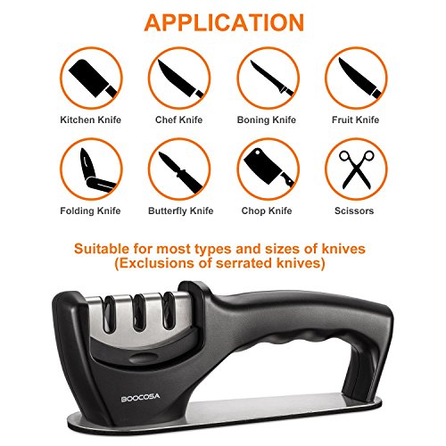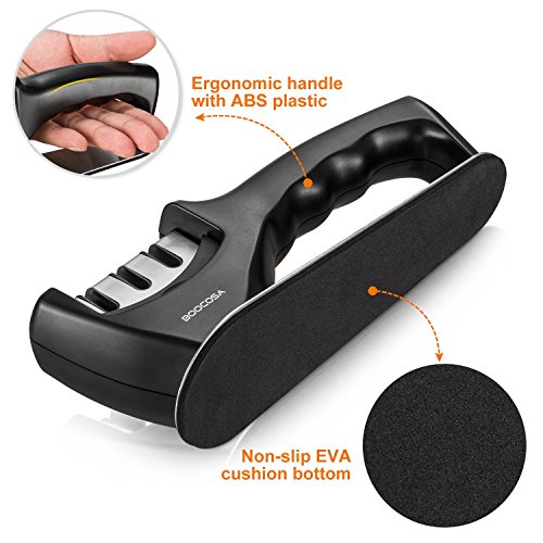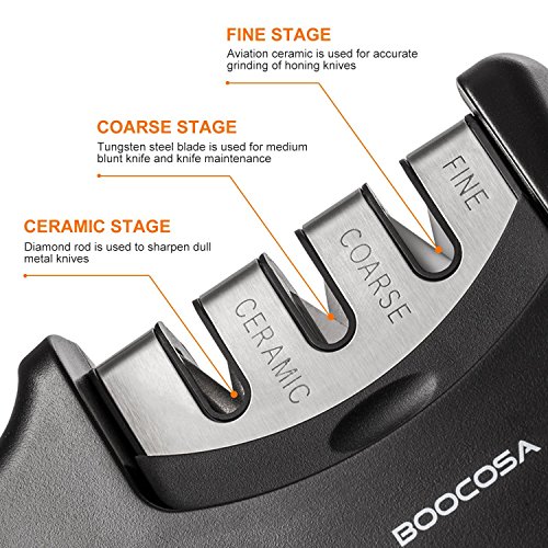 EFFECTIVE 3-STAGE KNIFE SHARPENING SYSTEM: This knife sharpener features a 3-stage sharpening system for effective knife sharpening. A diamond rod to sharpen ceramic knives and repair damaged blades, a tungsten steel blade to restore the V-shaped edge, and ceramic rod to finely sharpen and polish metal blades.